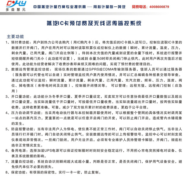 13、提示報警功能:汽、水量小于設定值控制箱會自動發出報警,提示用戶及時充值。